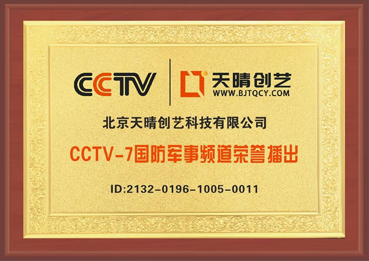 圖注:CCTV7國防軍事頻道給天晴創藝頒發的榮耀播出牌匾和ID號